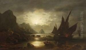 Mondnacht Am Chiemsee. Fischer Im Kahn. Am Ufer Manner Am Feuer