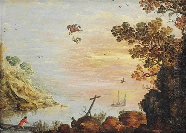 A Mountainous Seascape At Sunset With Bellerophon Falling Off Pegasus' Back, Fishermen In Boats And A Cross In The Foreground