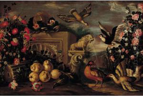 A Classical Garden Setting With Exotic Birds, Roses, Carnations, Pears And Figs Among Architectural Ruins