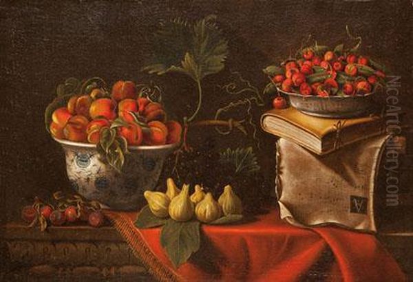 Bodegon De Frutos En Cuencos De Ceramica Azul Y Blanca, Libro Y Pergamino