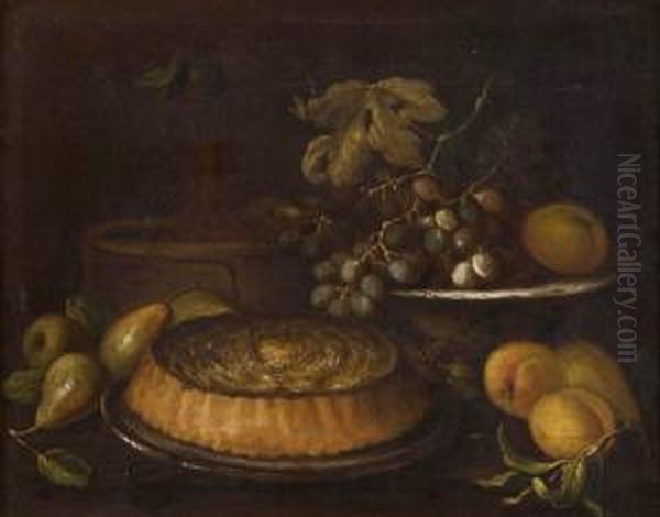Pere, Una Torta E Limoni, Un Cesto Con Una Bottiglia Ed Una Fruttiera Con Uva