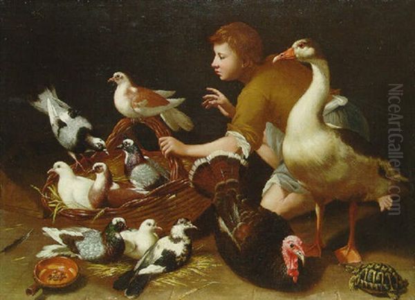 A Goose, A Hen, Pigeons And Doves In A Basket, With A Peasant Boy