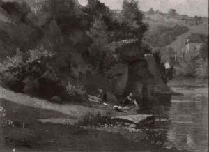 Besonnte Fluslandschaft An Der Ilz Mit Wascherinnen Am Ufer
