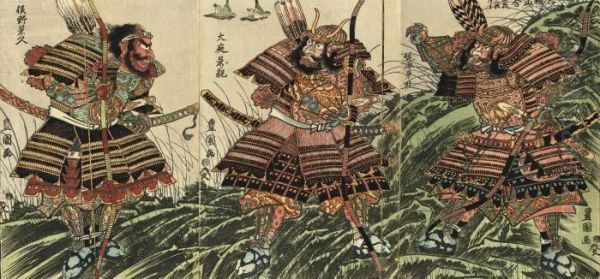Triptych Showing A Scene Of The Battle Of Ishibashiyama (king, Japanese Warrior Prints, No. 92), Published Yamamotoya Heikichi, Circa 1810-1814; One Triptych By Toyokuni I; And Four Single Prints Of Warriors By Toyokuni (ii), Good Impression, Colo