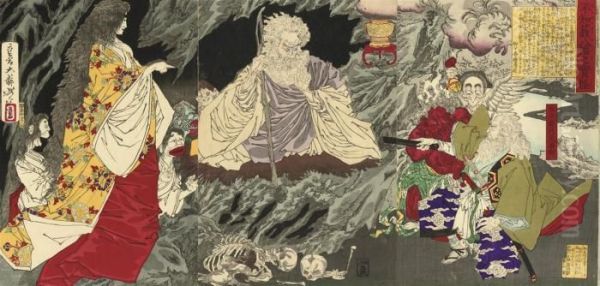 A Triptych Showing Mitokomon Mitsukuni-ko Subjugating A Ghost In Yahata, Published By Akiyama Buemon In 1881, Very Good Impression, Colour And Condition; And Two Triptychs By Yoshitoshi, One Showing Ema, The King Of Hell Flanked By The Spectres An