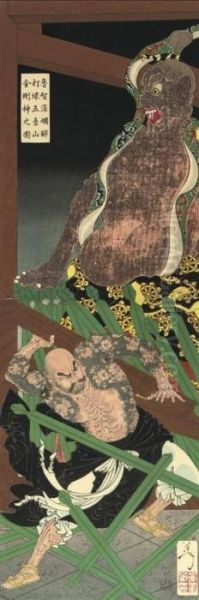 A Vertical Diptych, Lu Chi-shen Topples The Temple Gate Guardian In Rage, First Edition, 1887, Very Good Impression Colour And Condition; And The Second State Of The Vertical Diptych Showing Cho Jun, The White Stripes In The Waves, Wrestling In Th