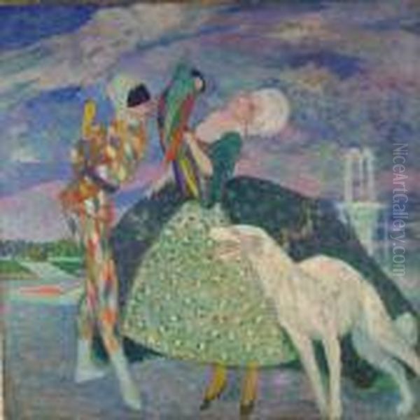 "arlecchino E Colombina" Olio Su Tela Firmato In Basso A Sinistra