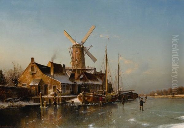A WINTER LANDSCAPE WITH A MILL ON A FROZEN RIVER