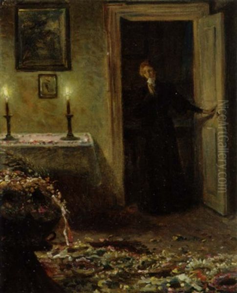 Bring the timeless beauty of Valdemar Irminger's Stilhed. Et Vaerelse Med Et Par Taendte Lys. Gulvet Daekket Af Kranse. En Ung Sorgende Pige Aabner Doren I Baggrunden into your home with a handmade oil painting reproduction. Carefully recreated on canvas by skilled artists using traditional techniques, this piece captures the delicate brushwork, subtle light, and vibrant color of the original masterpiece. With museum-level quality and rich texture, it brings elegance and artistic depth to any space. Enjoy free shipping and make this masterpiece a part of your personal collection.