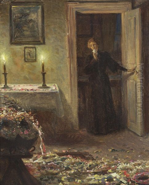 Bring the timeless beauty of Valdemar Irminger's Silence. A room with a few lights on. The floor covered with wreaths. A young girl in mourning opens the door in the background. into your home with a handmade oil painting reproduction. Carefully recreated on canvas by skilled artists using traditional techniques, this piece captures the delicate brushwork, subtle light, and vibrant color of the original masterpiece. With museum-level quality and rich texture, it brings elegance and artistic depth to any space. Enjoy free shipping and make this masterpiece a part of your personal collection.