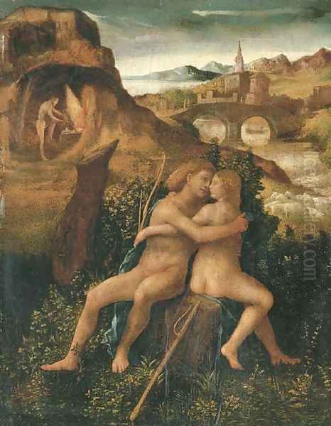 Venus and Mars in a river landscape with Vulcan labouring in his forge