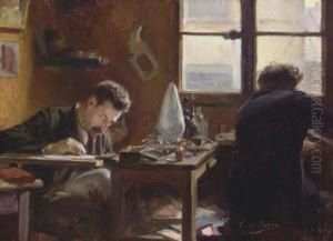 A Bishop And A Young Boy Weaving A Basket In An Interior