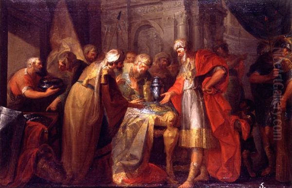 El rey Ezequias haciendo ostentacion de sus riquezas ante los legados del rey de Babilonia