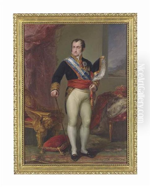 Portrait Of King Ferdinand Vii Of Spain (1784-1833), Small Full-length, In The Uniform Of Capitan General, Wearing The Order Of The Golden Fleece And Other Orders, Before A Draped Table With The Spanish Regalia