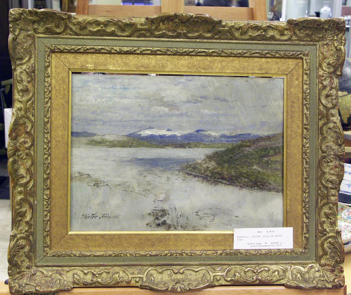 "landskap Med Fjallsjo, Navertinden I Norge". Prov: Professor Gunnar Hoving, Goteborg. Utstalld: Konstnarshuset, Stockholm, "minnesutstallning Over Victor Forssell", Sept 1950, Katnr 159.