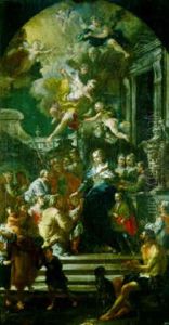 A woman and her child giving alms to two monks in the chapel of a church