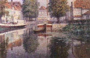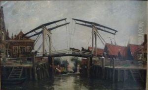 Winterliche Polder Landschaft Mit Verschneitem Ufer Und Stadtturmen Im Hintergrund (dordtrecht)