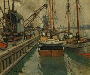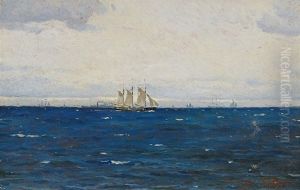 Coastal Scene With Sailing Ships On The Horizon (+ Harbour With Small And Larger Ships, 1949, Oil On Cardboard, Smaller; 2 Works)