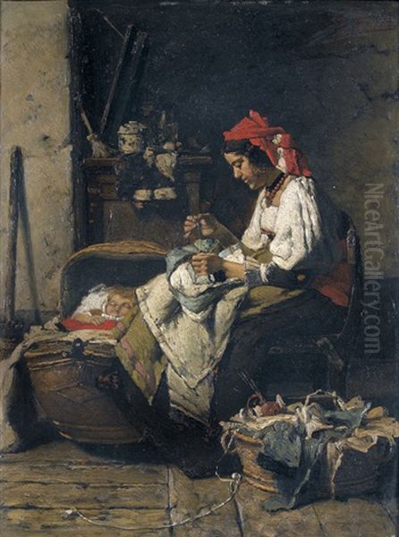 Mutter Mit Nahzeug Und Schlafendes Kind In Interieur
