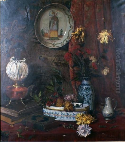 Nature Morte Au Vase De Fleurs, A La Lampe A Petrole Et A L'assiette En Nevers