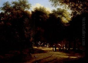 Travelers With Farm Animals On A Wooded Path