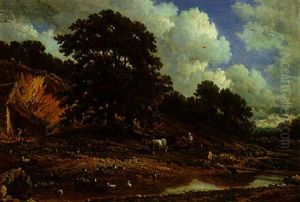 A Peasant Girl Herding Cattle Towards A Wooded Pond With Ducks, A Farmshed Beyond