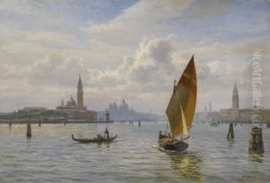 Aftenstemning fra Kobenhavns Havn med bade og talrige figurer.