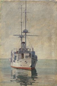 Marine med sejlskibe pa havet. 28 x 43 cm.