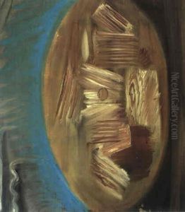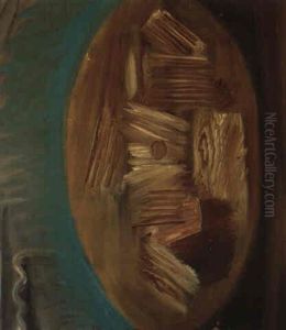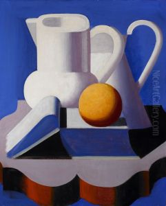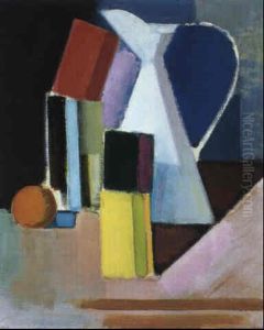 Opstilling Med Boger, Aesker, Papirruller Og Hvid Opsats Med To Appelsiner. Omkr. 1949