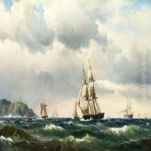 Seascape With Numerous Sailing Ships Near A Rockycoast Oil Painting by Vilhelm Melbye