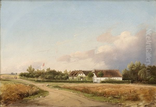 Landskab Med Storre Strataekt Bondegard Og Hejst Dannebrog, I Forgrunden Landevej, I Horisonten Figurer, Sommer