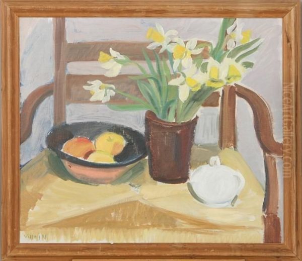 Still Life With Daffodils And Apples. Signed Ville J.n