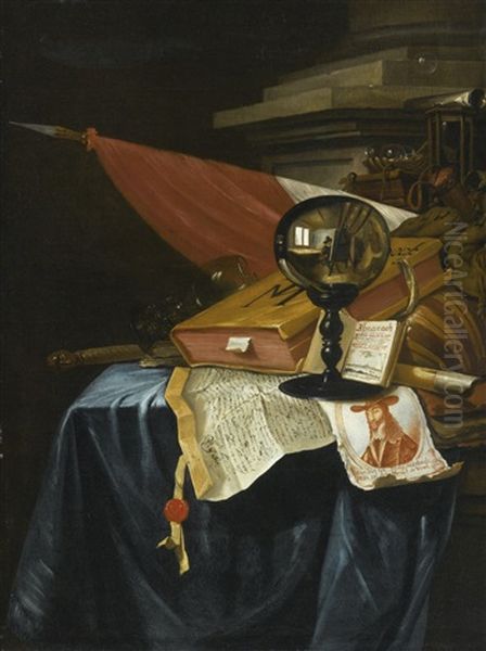 A Vanitas Still Life With A Crystal Ball Reflecting An Image Of The Artist At His Easel, A Book, A Lute, A Flag, A Chipped Roemer, A Flute, A Baton, An Hourglass...