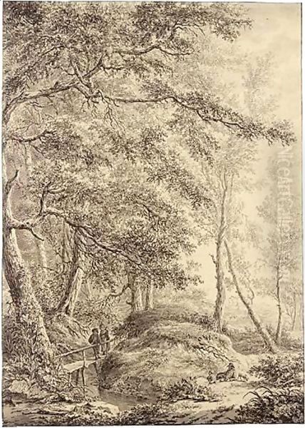 Peasants Crossing A Bridge At The Edge Of A Dense Wood, With Others Resting Nearby