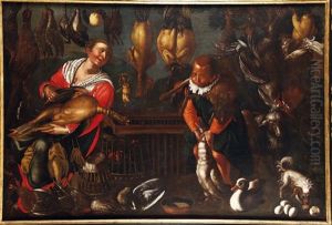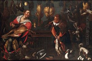 A Kitchen Interior With A Maid, Game, Meat And Fish With A Huntsman