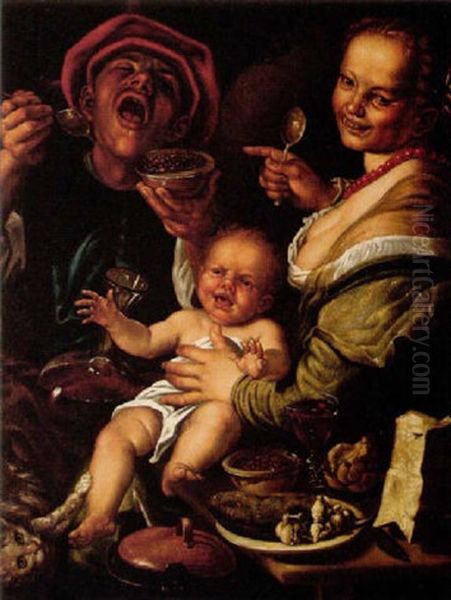 A Merry Peasant Couple Eating From A Bowl Of Beans, The Woman Holding A Crying Baby With A Cat Scratching Its Leg