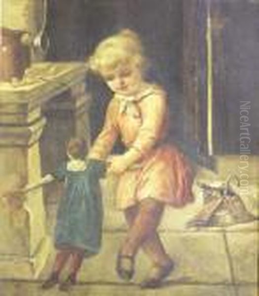 "playing With A Doll". Signed Tojetti U/l. Oil On Canvas. Measuring 16" By 14"