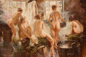 Bring the timeless beauty of Vitaly Gavrilovich Tikhov's In A Russian Banya into your home with a handmade oil painting reproduction. Carefully recreated on canvas by skilled artists using traditional techniques, this piece captures the delicate brushwork, subtle light, and vibrant color of the original masterpiece. With museum-level quality and rich texture, it brings elegance and artistic depth to any space. Enjoy free shipping and make this masterpiece a part of your personal collection.