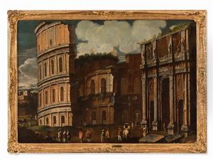 An Architectural Capriccio With Figures Bustling Before The Colosseum