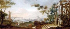 A Capriccio Of Classical Ruins With Figures On A Road, A Landscape With A Town Beyond