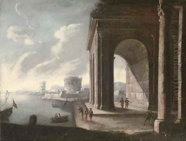 A Mediterranean coastal harbour with figures by a classical arch