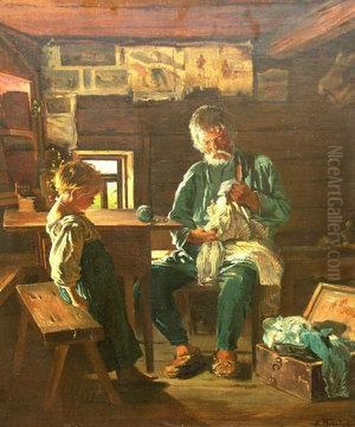 Portrait Of An Old Man With A Child In A Workshop Interior