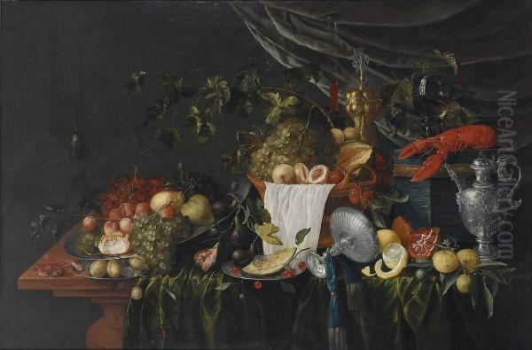 Exuberant large fruit piece with crab, prawns, lobster on a fabric box with roemer, ornate silver tazza, repousse ewer