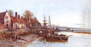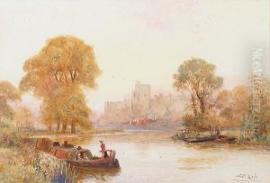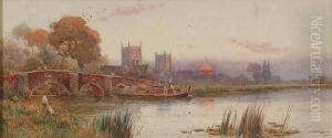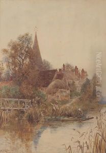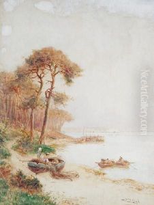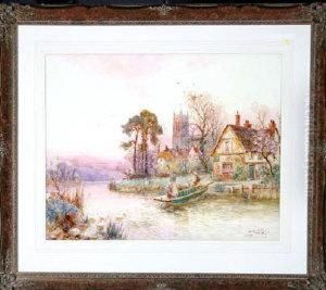 Figures On A Longboat With Figures Fishing On The River Bank And Distant Church