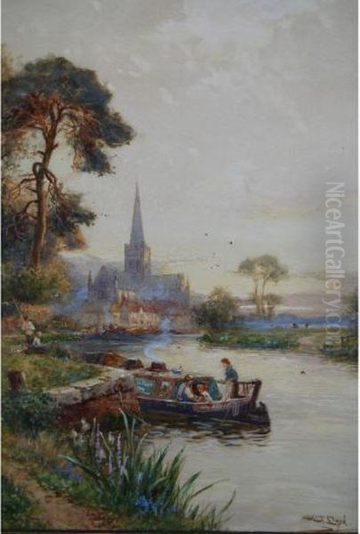 Figures On A Longboat With Figures Fishing On The River Bank And Distant Church