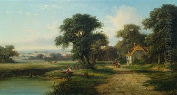 A River Landscape With Boy Seated On A Bank Fishing And Pastoral Landscape With A Mother And Child On A Country Lane With A Cottage, Woodland And Grazing Sheep