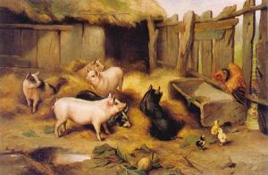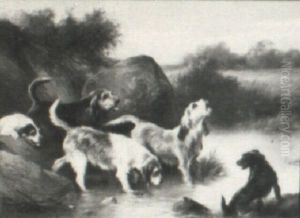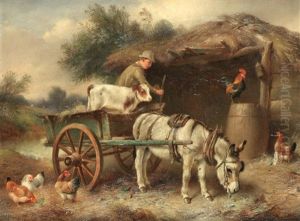 Calves, Chickens And A Duck Gathered By A Stream