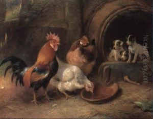 Calves, A Cockerel And Hens Beside A Barn