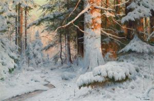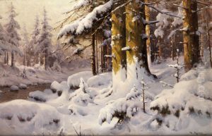 Stimmungsvolles, Verschneites Waldstuck Im Abendlicht Mit Bachlauf