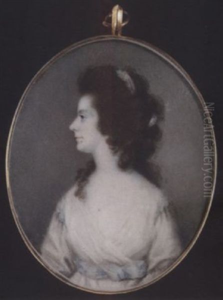 A Lady, Her Head Turned In Profile To The Left, Wearing White Dress With Pale Blue Waistband, Ribbons At Her Shoulders And In Her Hair